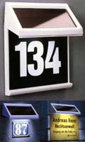 Solar powered lighted house number sign. Identifies your house to emergency services. Automatically switches on at dusk mounts on side of house or pole (not supplied). Rechargeable NiMh battery 260 hours of service when fully charged. Includes numbers and letters (a-f) kit. #02800 |